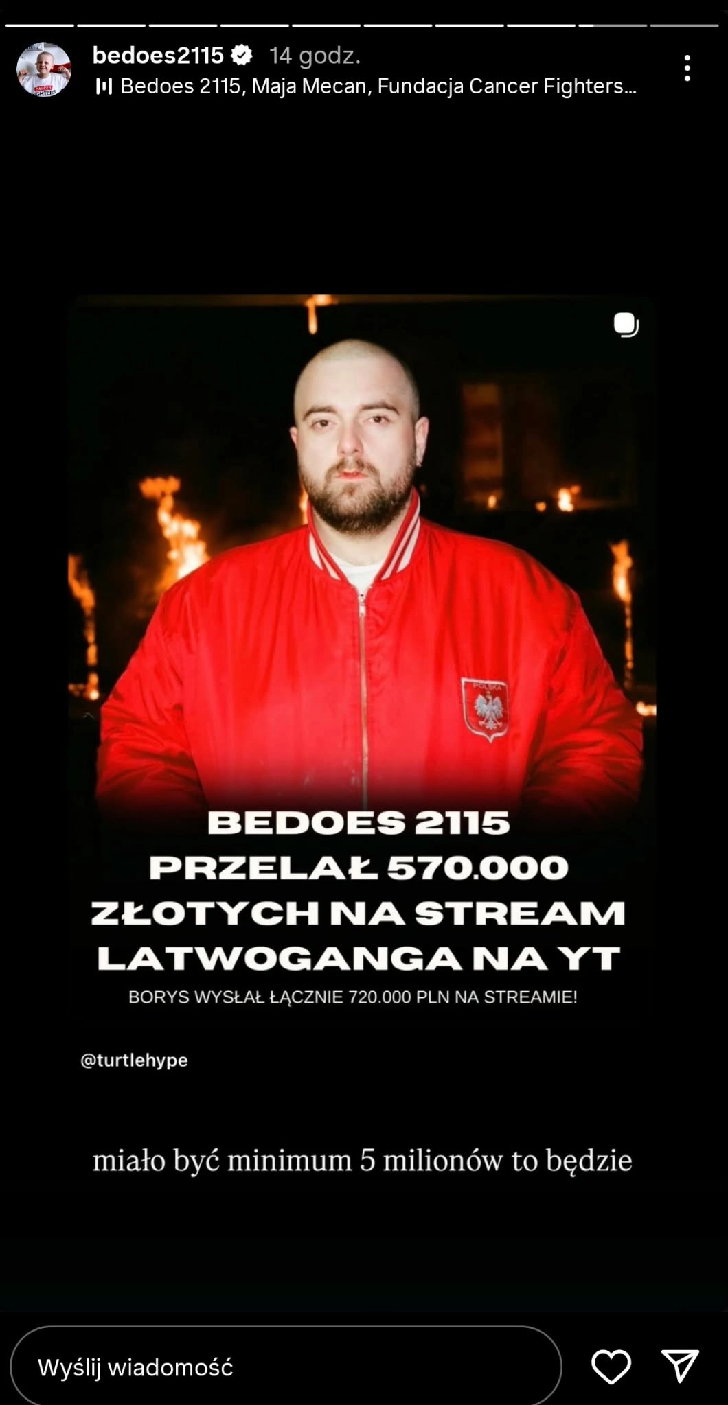 Bedoes pokazał, że ma ogromne serce. W środę 22 kwietnia 2026 roku, podczas trwającej już piąty dzień z planowanych dziewięciu transmisji na żywo na kanale Łatwogangu, której celem jest wsparcie Fundacji Cancer Fighters poprzez słuchanie „dissu na raka” w zapętleniu i zebranie pieniędzy dla jej podopiecznych, wpłacił ogromną sumę.