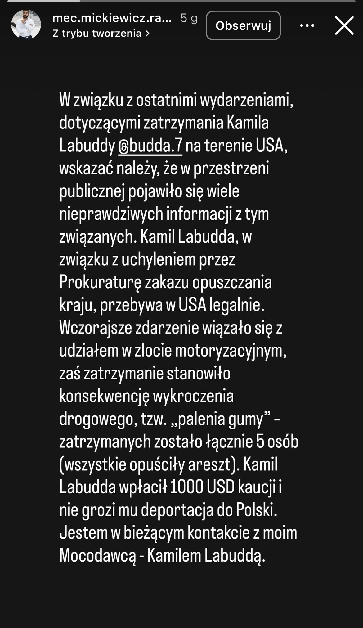 W związku z ostatnimi wydarzeniami dotyczącymi zatrzymania Kamila Labuddy na terenie USA wskazać należy, że w przestrzeni publicznej pojawiło się wiele nieprawdziwych informacji z tym związanych. Kamil Labudda, w związku z uchyleniem przez Prokuraturę zakazu opuszczania kraju, przebywa w USA legalnie. Wczorajsze zdarzenie wiązało się z udziałem w zlocie motoryzacyjnym, zaś zatrzymanie stanowiło konsekwencję wykroczenia drogowego, tzw. "palenia gumy".