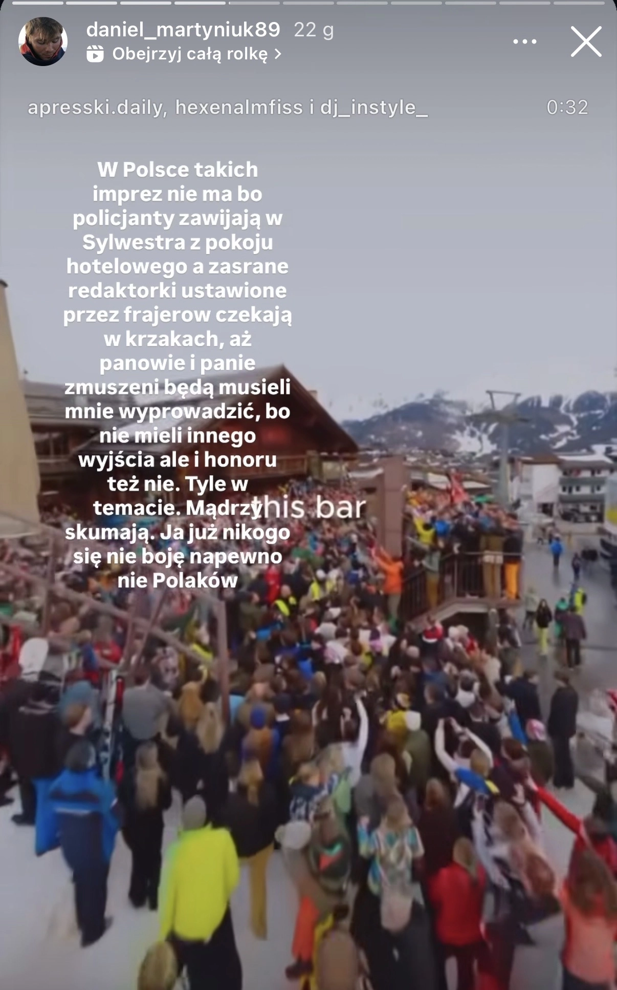 Na tym jednak się nie skończyło. Martyniuk opublikował również nagranie z zagranicznego, zimowego kurortu, które posłużyło mu jako pretekst do powrotu wspomnieniami do wydarzeń sprzed dwóch lat i porównania realiów imprezowania poza Polską z tym, co, według niego, spotkało go w Zakopanem. Według niego w polskich hotelach podczas sylwestra policja szybko interweniuje, a dziennikarze tylko czekają na okazję, by go nagrać. Podkreślił też, że w takich sytuacjach nie ma miejsca na honor, a on sam czuje się zmuszony do działania według własnych zasad. Podsumowując swoją wypowiedź, Daniel Martyniuk stwierdził: