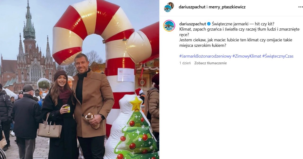 Dariusz Pachut już nie ukrywa swojej nowej partnerki. Na początku grudnia 2025 roku podróżnik i Merry Ptaszkiewicz podzielili się na swoich profilach na Instagramie wspólnym zdjęciem ze świątecznego jarmarku. Podpisali je: