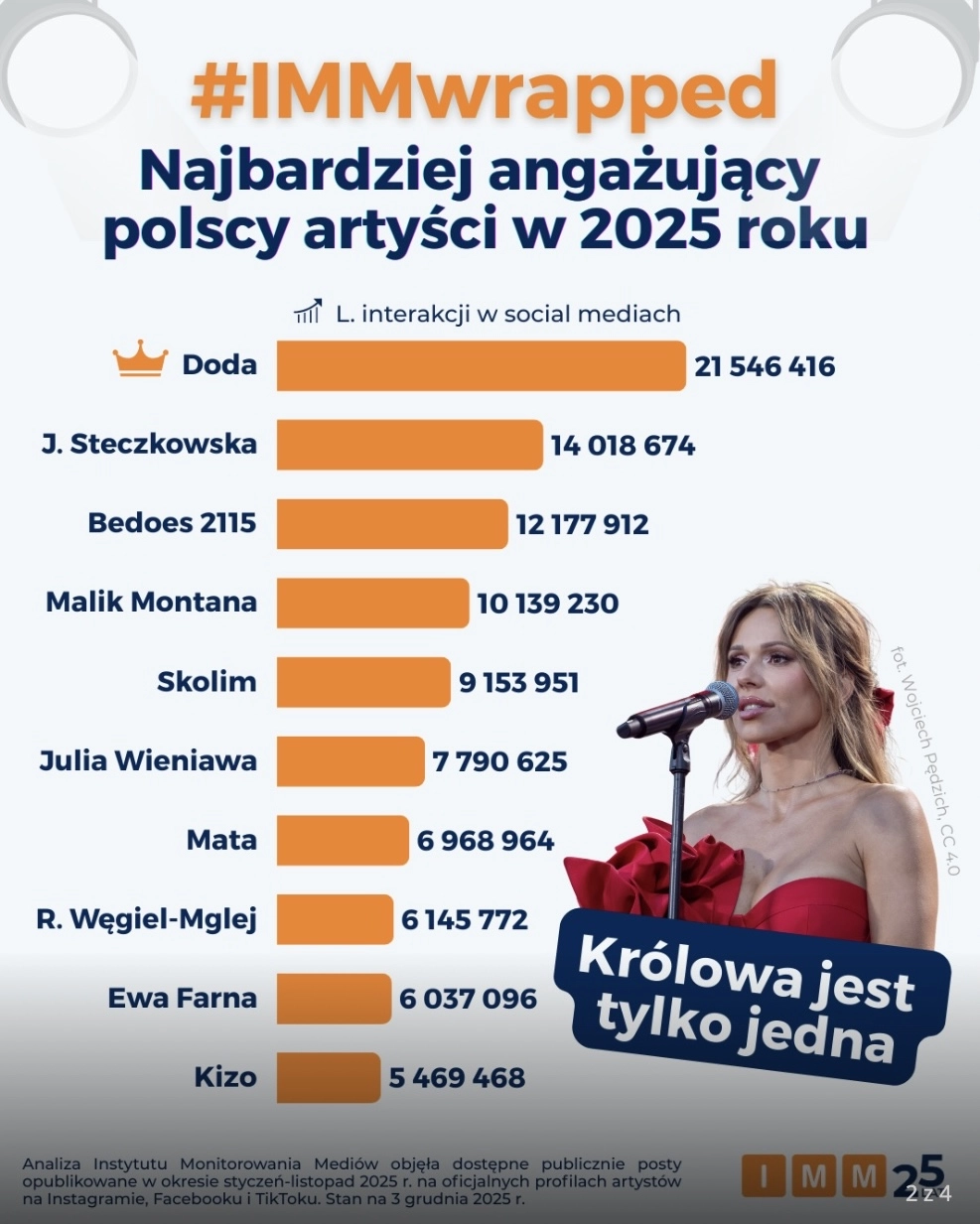 Instytut Monitorowania Mediów, wzorując się na corocznym zestawieniu Spotify Wrapped, przygotowało podsumowanie 2025 roku z perspektywy cyfrowej obecności polskiej muzyki. Raport pokazuje, które profile artystów, na Facebooku, Instagramie czy TikToku, cieszyły się największym zaangażowaniem fanów, a także które treści w sieci zyskały status viralowych i zrobiły największe wrażenie wśród odbiorców.