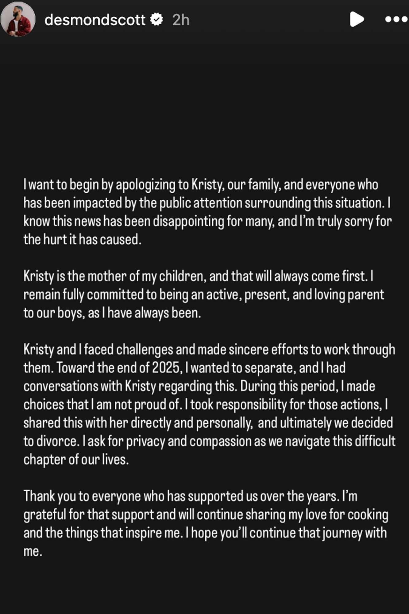 Kristy i ja mierzyliśmy się z trudnościami i szczerze próbowaliśmy je przezwyciężyć. Pod koniec 2025 roku chciałem się rozstać i rozmawiałem o tym z Kristy. W tym okresie podjąłem decyzje, z których nie jestem dumny. Wziąłem za nie odpowiedzialność, powiedziałem jej o tym bezpośrednio i osobiście, a ostatecznie zdecydowaliśmy się na rozwód. Proszę o prywatność i współczucie, gdy przechodzimy przez ten trudny etap naszego życia.