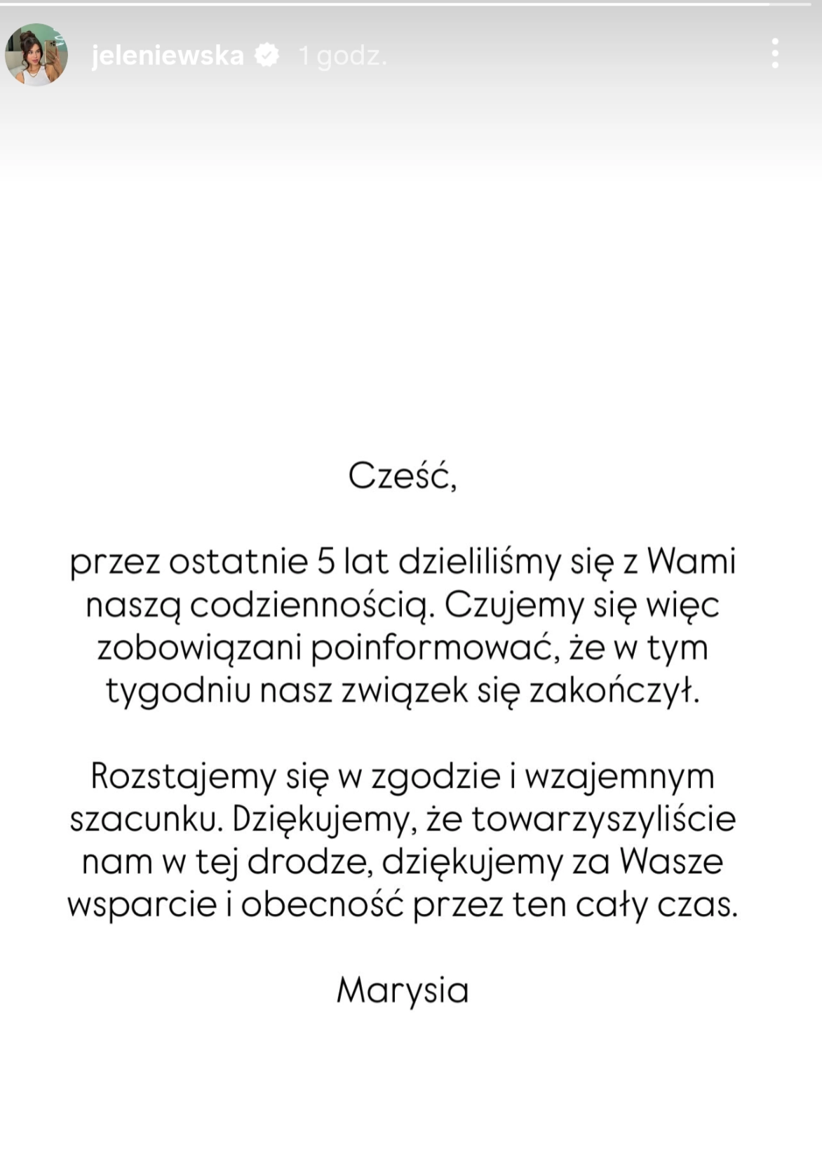Cześć, przez ostatnie 5 lat dzieliliśmy się z Wami naszą codziennością. Czujemy się więc zobowiązani poinformować, że w tym tygodniu nasz związek się zakończył. Rozstajemy się w zgodzie i wzajemnym szacunku. Dziękujemy, że towarzyszyliście nam w tej drodze, dziękujemy za Wasze wsparcie i obecność przez ten cały czas. Marysia.