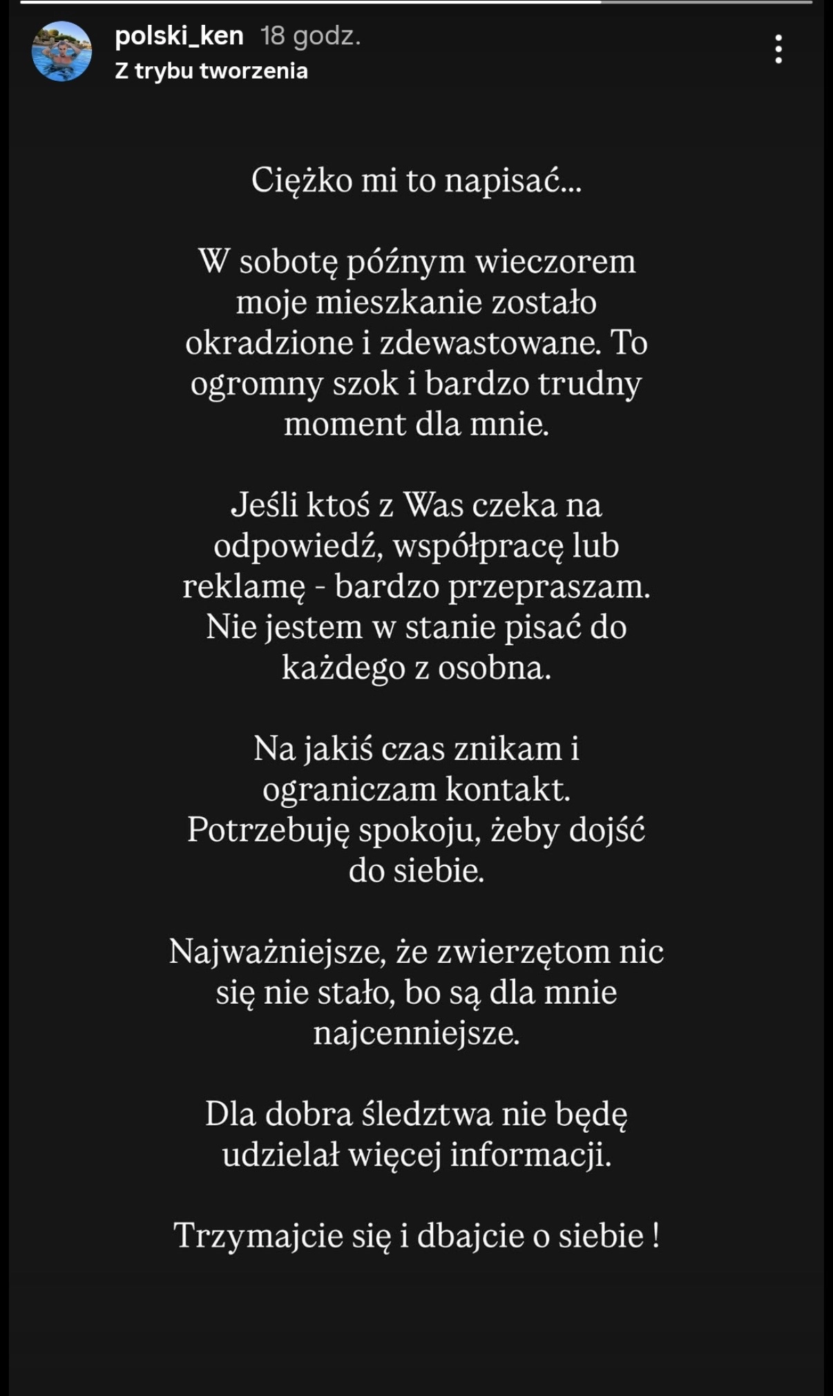 Influencer zaznaczył również, że nie udzieli dodatkowych informacji na temat włamania ani wysokości strat, ponieważ śledztwo wciąż trwa. Sprawą zajmują się odpowiednie służby, a sam Michał podkreślił, że całe doświadczenie mocno wpłynęło na jego codzienność i życie prywatne.