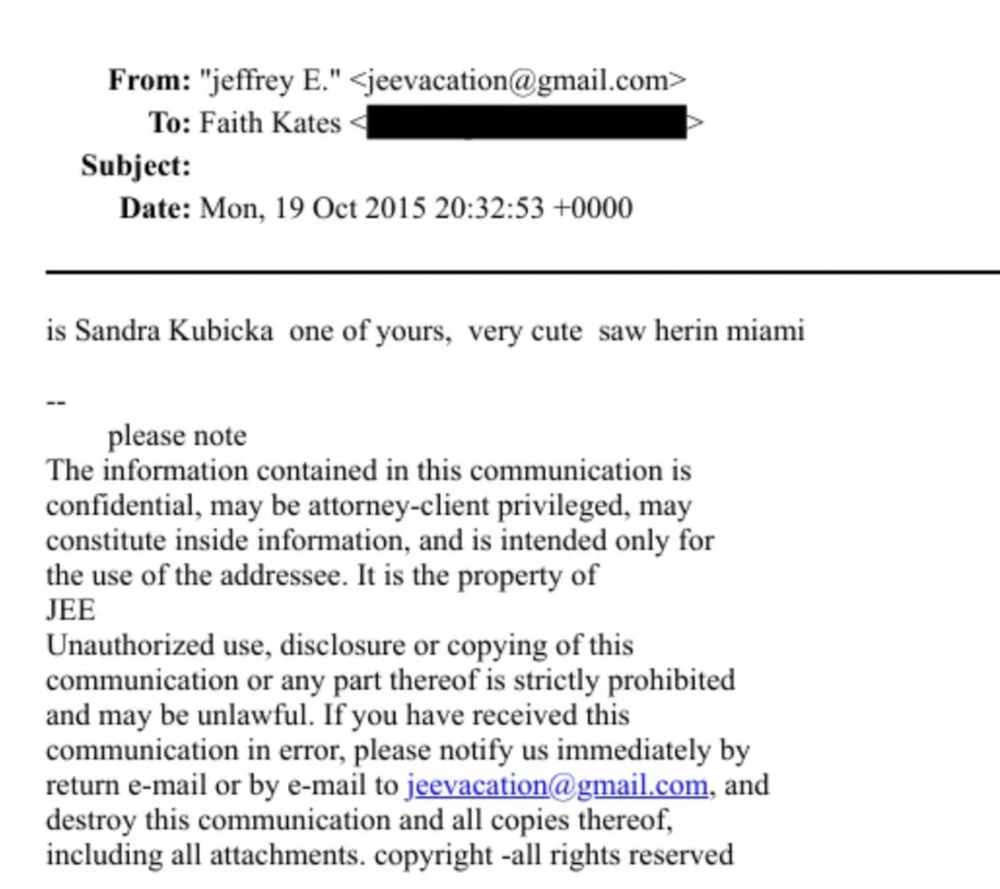 Wśród tysięcy stron dokumentów znalazły się także informacje dotyczące osób, które nie były bezpośrednio powiązane z przestępczą działalnością Epsteina. Wiele nazwisk pojawiało się jedynie w kontekście obserwacji lub wspomnianych rozmów, nie jako uczestnicy procederu. W aktach natrafiono jednak na ślad dotyczący Polski. Jak się okazało, w e-mailu wysłanym 19 października 2015 roku z konta powiązanego z Epsteinem do Faith Kates, właścicielki renomowanej agencji modelingowej Next Model Management, pojawia się nazwisko Sandry Kubickiej. Wiadomość zawierała krótką uwagę skierowaną do szefowej agencji:
