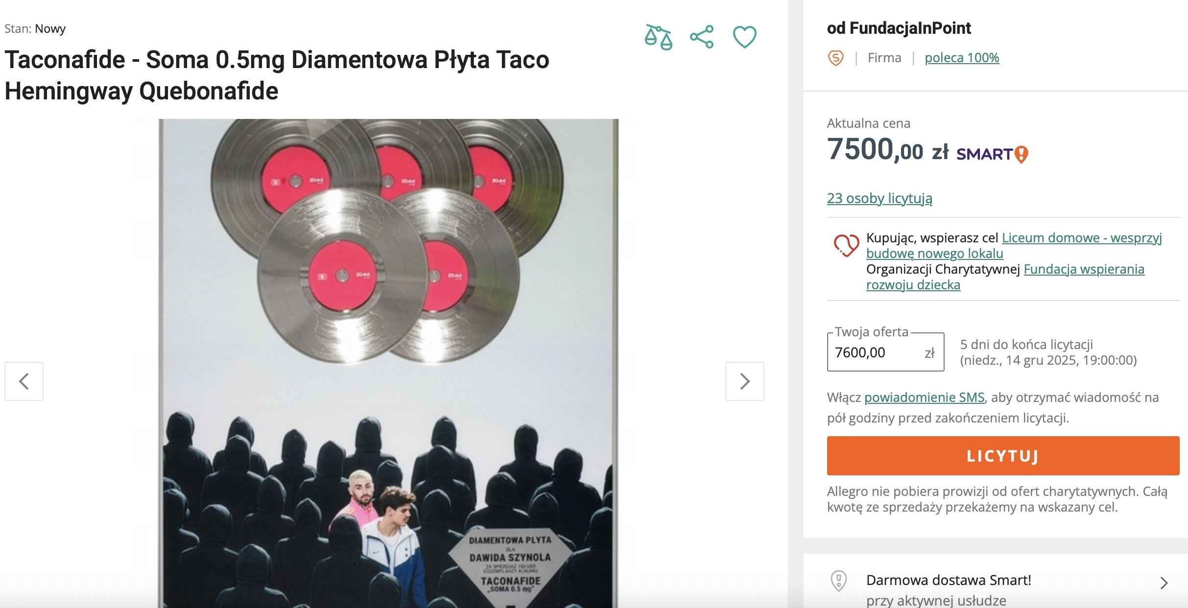 Album Soma 0.5mg duetu Taconafide osiągnął status diamentowej płyty, sprzedając ponad 150 tysięcy egzemplarzy i zdobywając miejsce w historii polskiego rapu jako jedno z najbardziej kultowych wydawnictw. Fenomen tego albumu sprawił, że każdy jego egzemplarz stał się prawdziwym rarytasem dla fanów oraz kolekcjonerów. Teraz wyjątkowa okazja pojawia się po raz kolejny, ponieważ płyta właśnie trafiła na aukcję na platformie Allegro w ramach świątecznej akcji charytatywnej. Licytacja potrwa do 14 grudnia 2025 roku do godziny 19:00, a do tej pory wzięło w niej udział ponad dwudziestu uczestników. W momencie powstawania artykułu cena aukcji osiągnęła 7 500 złotych.
