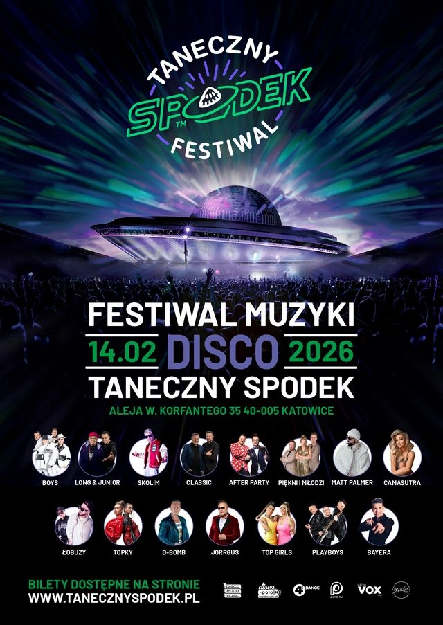 Taneczny Spodek to największe hity polskiego disco i kilkugodzinna zabawa, której z pewnością dadzą się porwać wszyscy. Ubiegłoroczna edycja imprezy w kosmicznym symbolu Śląska przyciągnęła tysiące fanów muzyki disco z całej Polski. Legendarna hala po raz kolejny stanie się centrum tanecznej zabawy 14 lutego 2026 roku, w walentynkową sobotę kończącą karnawał. Bez wątpienia niejedno serce da się porwać wtedy rytmom disco, a może nawet odnajdzie miłość w tanecznych rytmach. Najlepszej muzyki i niepowtarzalnej atmosfery dostarczą największe gwiazdy polskiej muzyki tanecznej, znane z hitów z setkami milionów wyświetleń na YouTube. Niezapomnianych emocji dostarczy też spektakularna oprawa techniczno-wizualna.