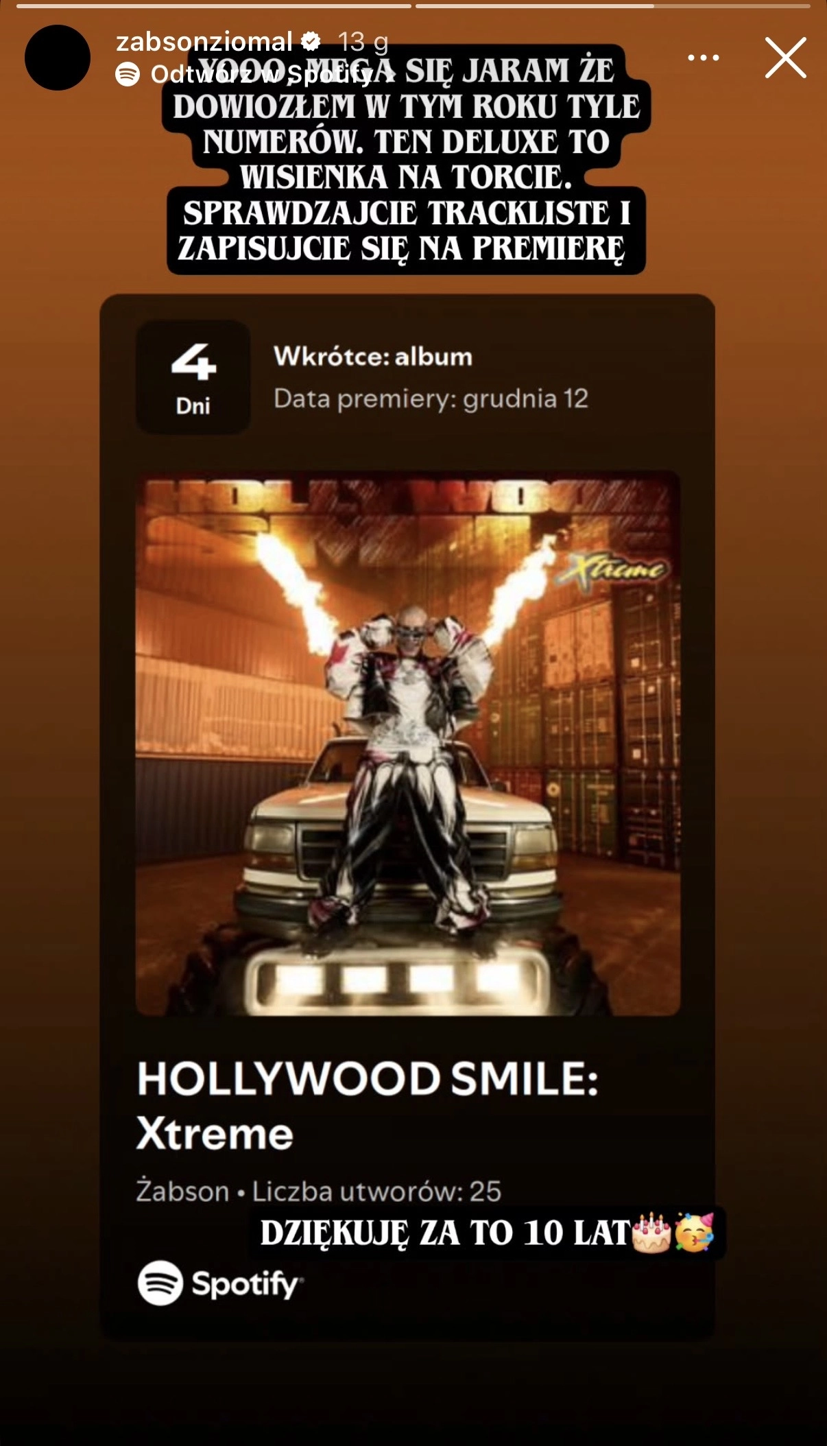 Żabson oficjalnie potwierdził, że wkrótce wypuści rozszerzoną wersję swojego albumu Hollywood Smile: Xtreme. Na płycie znajdzie się 10 utworów, w tym siedem całkowicie nowych nagrań. Wśród premierowych kawałków uwagę fanów przyciąga długo wyczekiwany singiel Klasyk, który Żabson nagrał wspólnie z Wiz Khalifą. Podczas niedawnej transmisji na żywo raper przyznał, że możliwość wydania wspólnego utworu była dla niego wyjątkowo wyczekiwaną wiadomością.